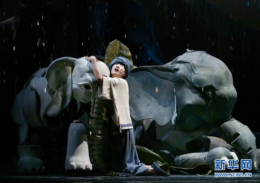 5月15日在上海美琪大戲院拍攝的新版大型人偶舞臺劇《最后一頭戰(zhàn)象》劇照。 當(dāng)日,作為第12屆中國藝術(shù)節(jié)的參演劇目,大型人偶舞臺劇《最后一頭戰(zhàn)象》在經(jīng)過4次硬件技術(shù)升級和故事修改后亮相上海美琪大戲院。 新華社記者 任瓏 攝