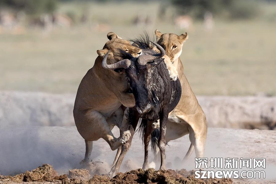 英國攝影師蘇-莫里斯(Sue Morri)在博茨瓦納Nxai Pan國家公園游玩,目睹了一場兇惡母獅獵食角馬的畫面。母獅甚至攀到了角馬背上,想要牢牢遏制住到手的“美餐”。強(qiáng)壯的角馬努力地與母獅抗?fàn)帲吡ο胍W∽约旱男悦?,但最終還是不敵母獅被拿下,最后成了母獅孩子們的盤中餐。