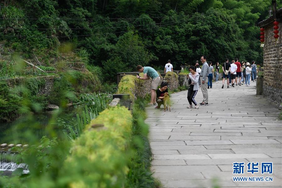 游客在石舍村游覽(5月25日攝)。 石舍村是浙江省桐廬縣富春江鄉(xiāng)村慢生活體驗區(qū)中的三個村落之一,位置偏僻,依溪而居,風(fēng)景秀美。近年來,石舍村結(jié)合古建筑保護(hù)工作,在清潔、美化村莊的基礎(chǔ)上,對一些廢棄古建筑進(jìn)行修繕,引入咖啡館、民宿等文化創(chuàng)意類項目,優(yōu)良的生態(tài)環(huán)境和濃郁的文化氛圍吸引大批游客前來體驗,小山村走上了一條發(fā)展美麗經(jīng)濟(jì)之路。2018年,石舍村接待游客10萬8千余人次,旅游經(jīng)營凈收入1260余萬元。 新華社記者 黃宗治 攝