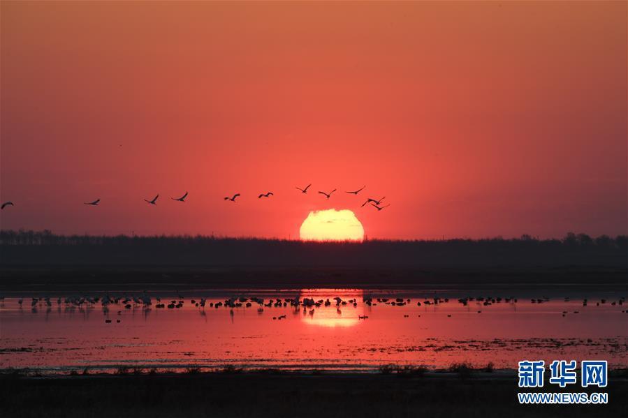 在吉林莫莫格國(guó)家級(jí)自然保護(hù)區(qū),一群白鶴從濕地上空飛過(4月11日攝)。 新華社記者 張楠 攝