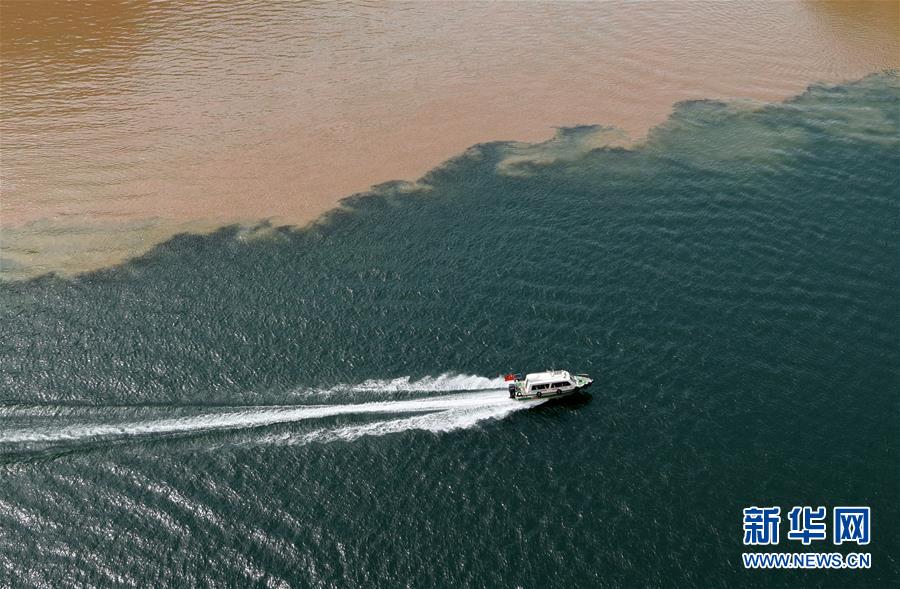 6月2日,在甘肅省臨夏回族自治州永靖縣劉家峽水庫,一艘快艇在洮河和黃河的匯合水域行駛。