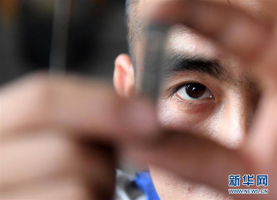 5月30日,在融水苗族自治縣安太鄉(xiāng)小桑村青山屯,杜信文檢查蘆笙簧片打磨情況。 新華社記者 陸波岸 攝
