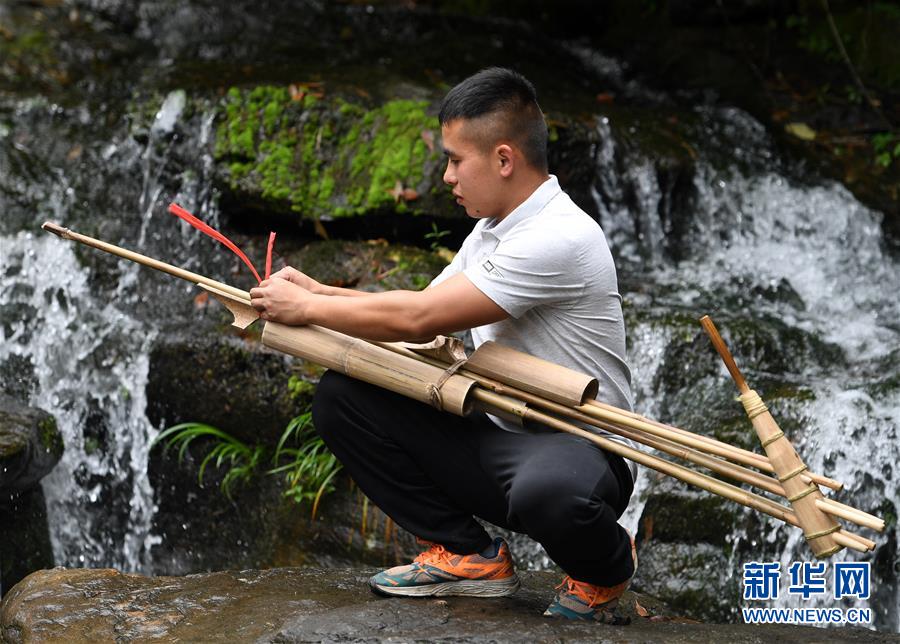 5月30日,在融水苗族自治縣安太鄉(xiāng)小桑村青山屯,杜信文在挑選熏干的竹子準備做蘆笙。 新華社記者 陸波岸 攝