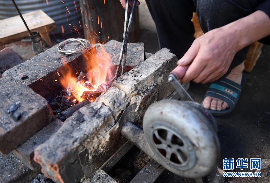 5月29日,在廣西融水苗族自治縣融水鎮(zhèn),銀匠陳四先鼓風(fēng)吹旺炭火準備打造銀飾。