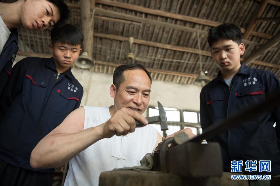 5月21日,鄭國榮在一把寶劍上鏨刻龍鳳紋,徒弟們?cè)谂赃厡W(xué)習(xí)。 新華社記者 翁忻旸 攝