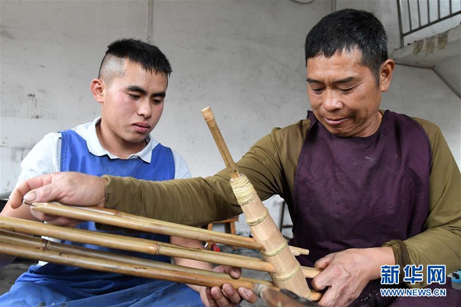 5月30日,在融水苗族自治縣安太鄉(xiāng)小桑村青山屯,杜信文(左)和父親杜慶仁一起制作蘆笙。 新華社記者 陸波岸 攝