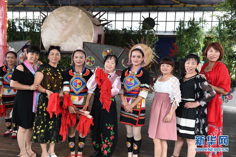 游客與基諾族大鼓舞演員合影(6月1日攝)。 在云南省西雙版納傣族自治州景洪市基諾山基諾族鄉(xiāng)的基諾族村寨,每天的基諾大鼓舞表演吸引了眾多游客前來觀賞體驗,帶動了基諾族群眾就業(yè)和增收。基諾族大鼓舞蘊涵豐富的歷史文化內(nèi)涵,已被列入國家級非物質(zhì)文化遺產(chǎn)保護(hù)名錄。 新華社記者 楊宗友 攝