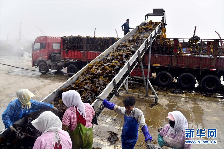 6月5日,在榮成市尋山街道青魚灘村,漁民在收獲海帶。 近日,山東省榮成市迎來海帶收獲季。據(jù)悉,榮成市海帶養(yǎng)殖面積14.5萬畝,年產(chǎn)海帶43.3萬噸以上。 新華社記者郭緒雷攝