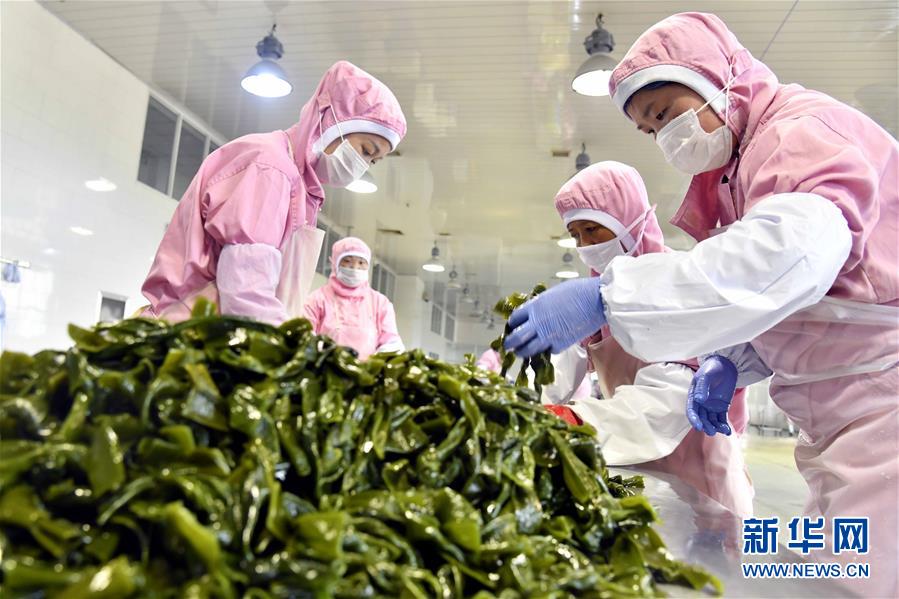 6月5日,在榮成一家水產(chǎn)養(yǎng)殖公司,工作人員在加工海帶。 近日,山東省榮成市迎來(lái)海帶收獲季。據(jù)悉,榮成市海帶養(yǎng)殖面積14.5萬(wàn)畝,年產(chǎn)海帶43.3萬(wàn)噸以上。 新華社記者林繁晶攝