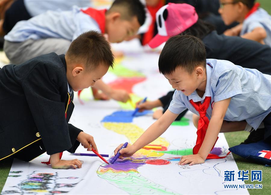 6月5日,陜西師范大學(xué)附屬小學(xué)的學(xué)生在長(zhǎng)卷上畫龍舟。新華社記者 張博文 攝