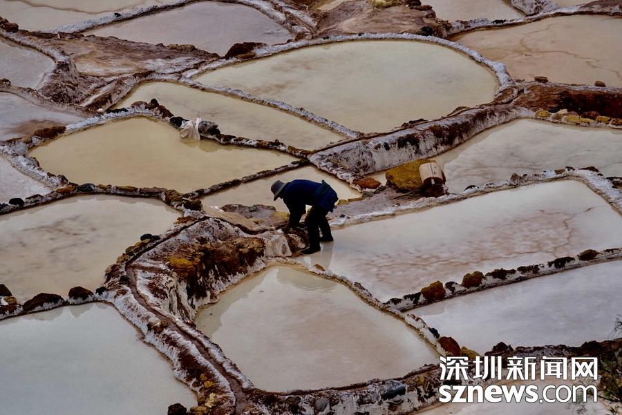 秘魯的鹽礦,100萬年前是大海,地殼運動演變?yōu)殛懙匾院?,地下水富含鹽分,古印加人發(fā)現鹽礦并運用水平鹽田曬鹽,其工藝技術一直沿用至今。李仁奇攝