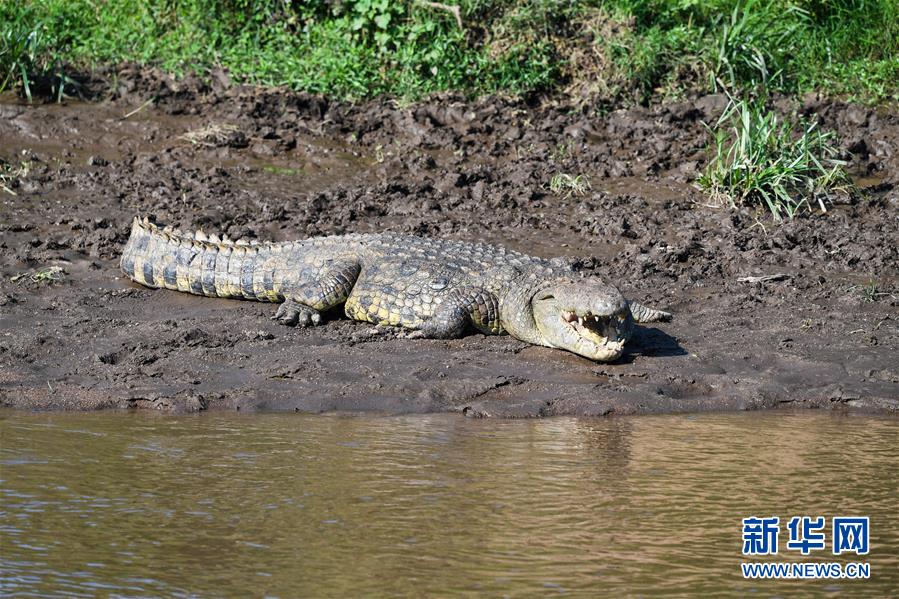 6月17日,在肯尼亞馬賽馬拉國(guó)家保護(hù)區(qū),一條鱷魚在水邊休息。 新華社記者 李琰 攝