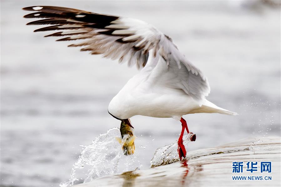 7月6日,在青海省剛察縣沙柳河里,一只棕頭鷗捕捉到一只躍起的湟魚。 新華社記者 劉金海攝