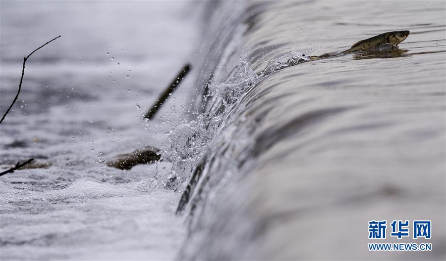 7月6日,在青海省剛察縣沙柳河里,一只湟魚躍起向上洄游。 新華社記者 費茂華攝