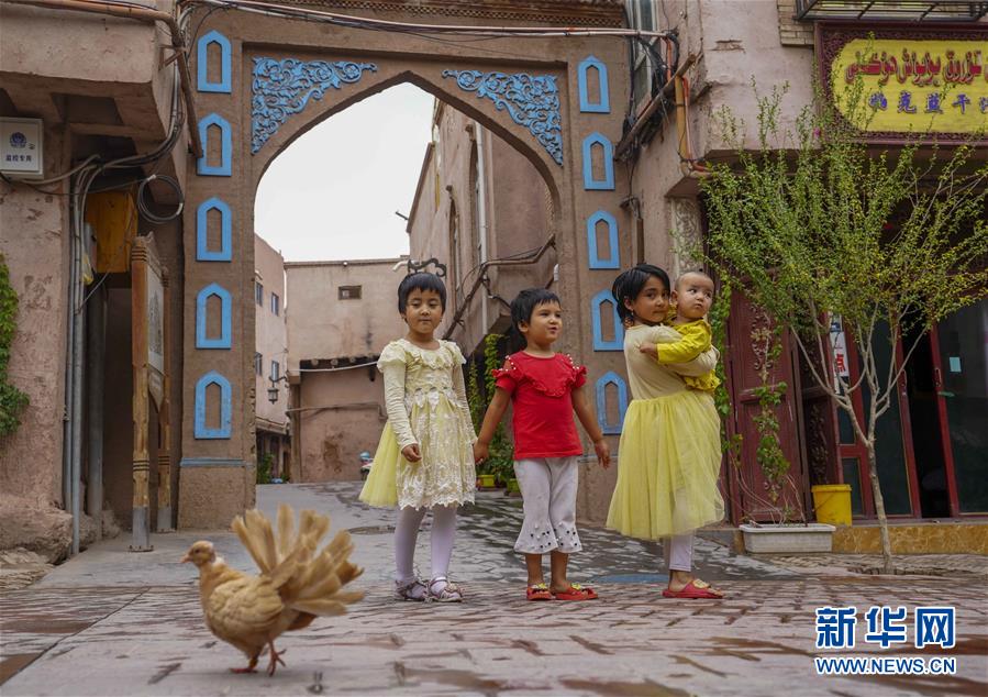 7月7日,小朋友在雨中的喀什古城景區(qū)玩耍。  新華社記者 趙戈 攝