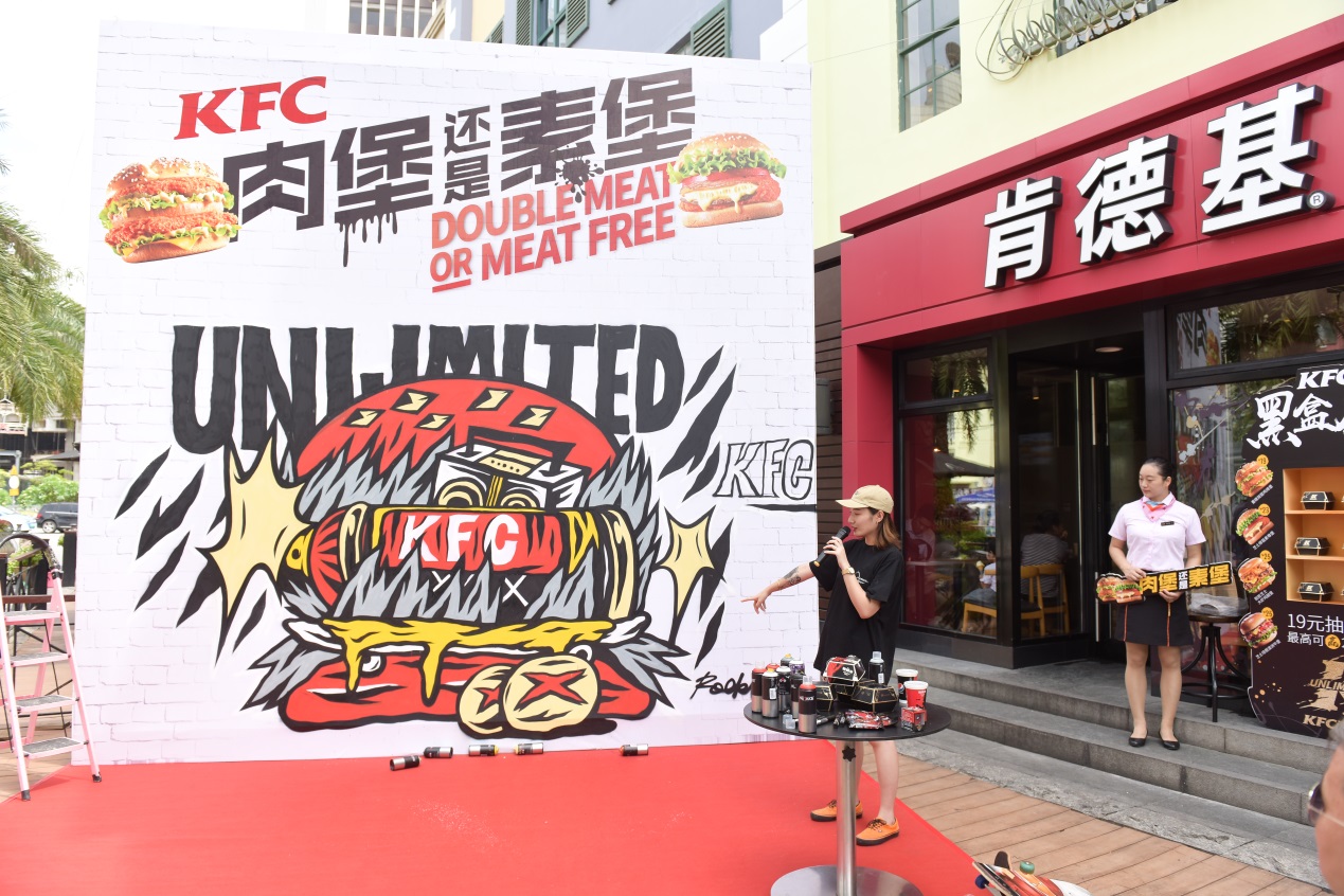 “肯德基是我非常喜歡的品牌,新潮、時尚。這一次與KFC的涂鴉合作,我在漢堡涂鴉的畫面中融入了像滑板、打碟機(jī)這樣的潮流元素,來演繹KFC厚菇堡這一款極具創(chuàng)新性的漢堡。用噴漆罐表現(xiàn)一整塊芝士厚菇,一口咬下能噴出濃郁的芝士;火焰燃燒的造型代表漢堡中肆意的醬汁,增加視覺沖擊感,呈現(xiàn)出一個沒有肉,但很real的霸氣素漢堡?!闭劶皠?chuàng)作理念,ROCKLEE說道,“這種結(jié)合我覺得很有意義,一方面展現(xiàn)了涂鴉這種街頭文化多元的一面,另一方面也傳遞出KFC在漢堡界young OG的全新形象?!睆膭?chuàng)作到完工,整個過程都引來路人圍觀、拍照。從朋友圈看到消息的潮人又不斷向此聚集、花式打卡。