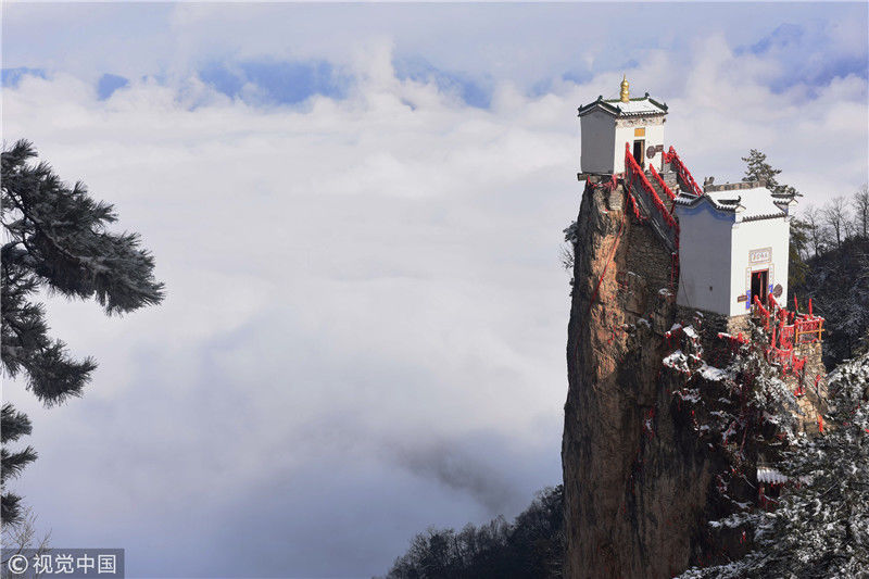 3月3日拍攝的塔云山金頂觀音殿。雪后初霽,秦嶺深處的塔云山景區(qū)云海翻騰,宛如仙境。位于陜西省鎮(zhèn)安縣柴坪鎮(zhèn)境內(nèi)的塔云山,其主峰上的古建筑群始建于明正德年間,其中金頂觀音殿建于塔云山萬仞絕頂之上,遠遠望去,壯觀無比。 新華社記者陶明攝