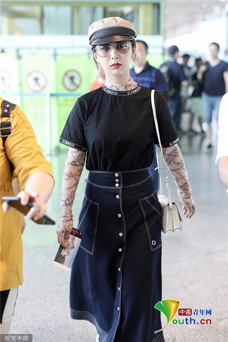 2019年7月25日,北京,楊紫現(xiàn)身機(jī)場。她穿黑色短T配牛仔裙變時(shí)髦女郎,戴報(bào)童帽架墨鏡”港風(fēng)女sir“即視感,人氣爆棚。
