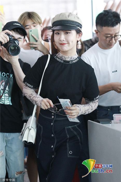 2019年7月25日,北京,楊紫現(xiàn)身機(jī)場(chǎng)。她穿黑色短T配牛仔裙變時(shí)髦女郎,戴報(bào)童帽架墨鏡”港風(fēng)女sir“即視感,人氣爆棚。