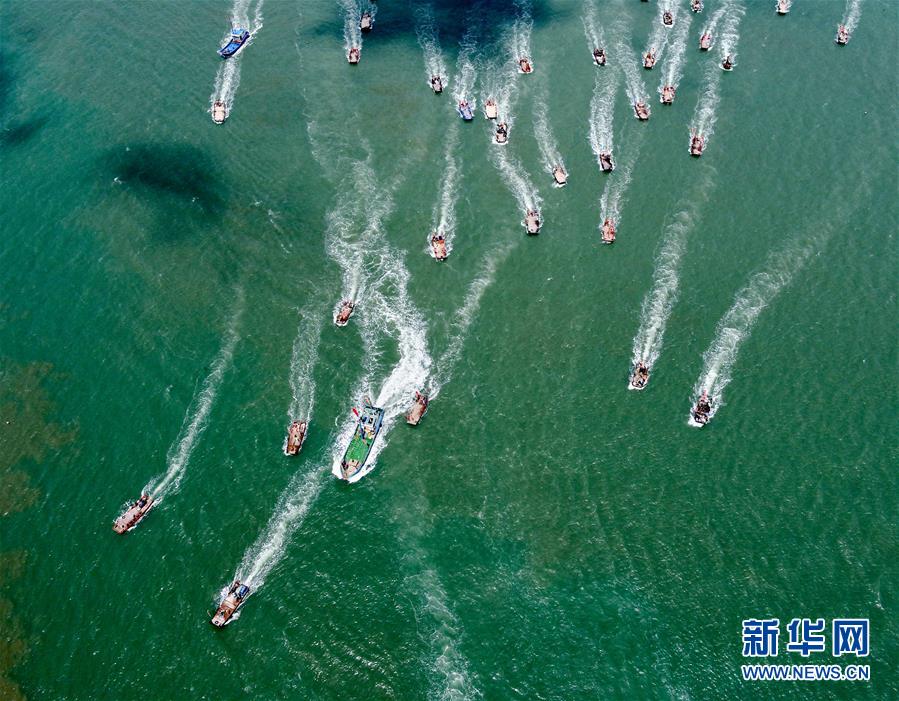 8月3日,在首屆福清開漁節(jié)上,漁船駛向大海(無人機拍攝)。新華社記者姜克紅攝