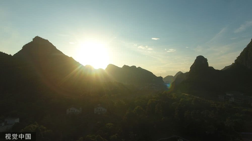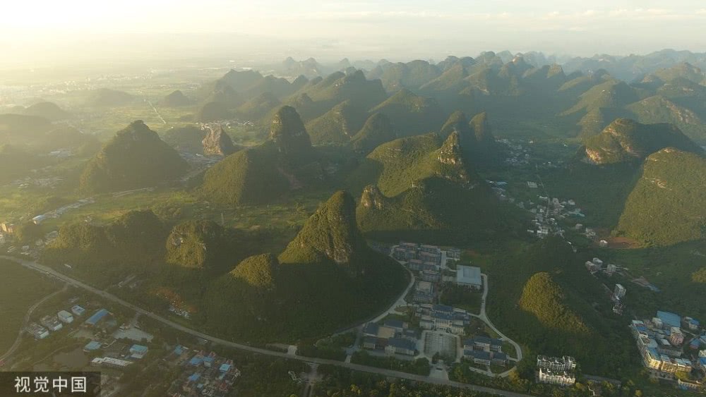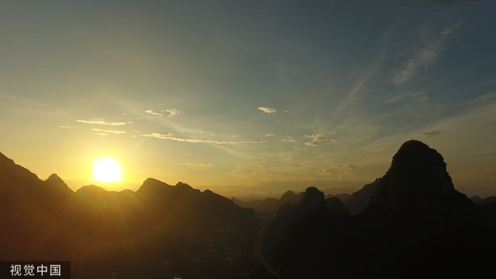 廣西桂林,晨光照映下,山水美景如畫。
