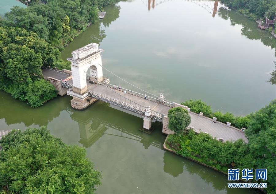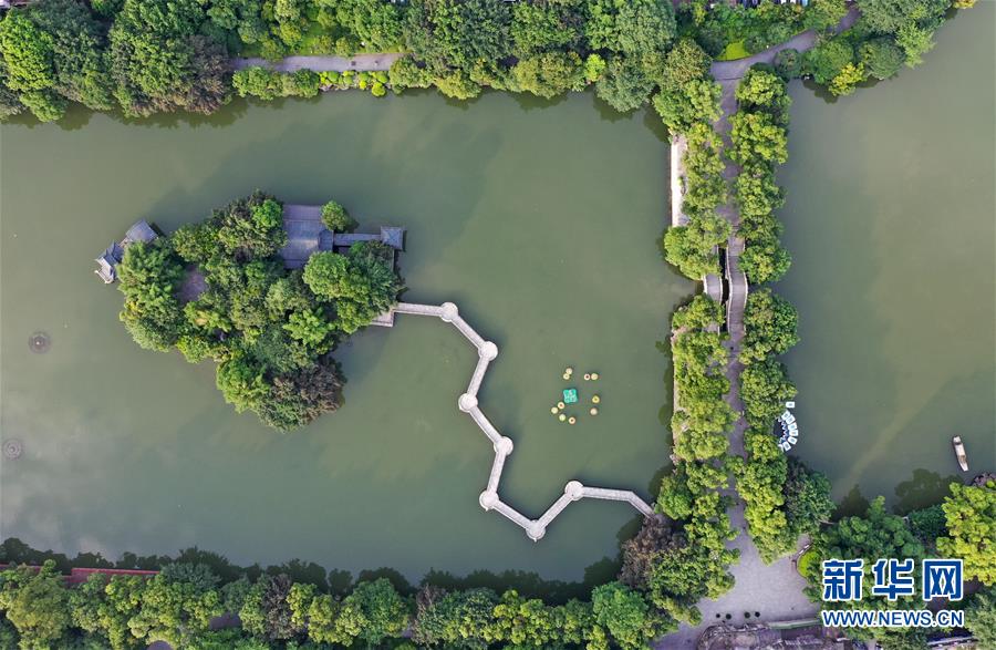 桂林市榕湖上的橋梁(7月1日無(wú)人機(jī)拍攝)。 夏日時(shí)節(jié),廣西桂林市區(qū)內(nèi)的榕湖、杉湖、桂湖、木龍湖等地綠樹成蔭、景色迷人。 新華社記者陸波岸攝