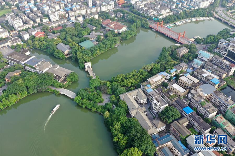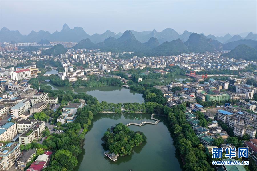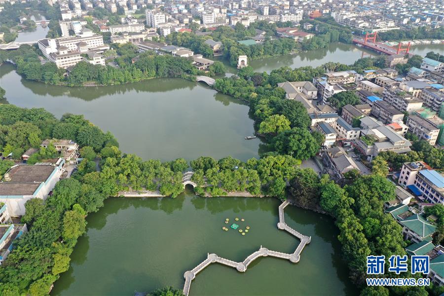 桂林市榕湖附近景觀(7月1日無(wú)人機(jī)拍攝)。 夏日時(shí)節(jié),廣西桂林市區(qū)內(nèi)的榕湖、杉湖、桂湖、木龍湖等地綠樹成蔭、景色迷人。 新華社記者陸波岸攝