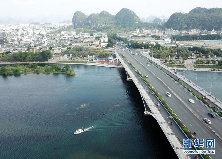 船只從橫跨漓江的廣西桂林市解放橋旁駛過(10月17日無(wú)人機(jī)拍攝)。 新華社記者 周華 攝