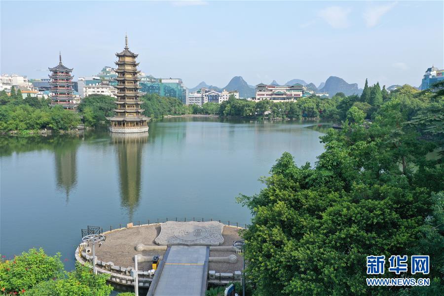 桂林市杉湖景觀(7月1日無(wú)人機(jī)拍攝)。 夏日時(shí)節(jié),廣西桂林市區(qū)內(nèi)的榕湖、杉湖、桂湖、木龍湖等地綠樹成蔭、景色迷人。 新華社記者陸波岸攝