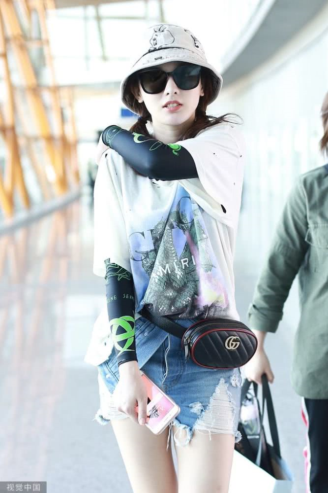內(nèi)地女星彭小苒現(xiàn)身機(jī)場,穿印花T恤牛仔短褲,白色馬丁靴很時(shí)髦