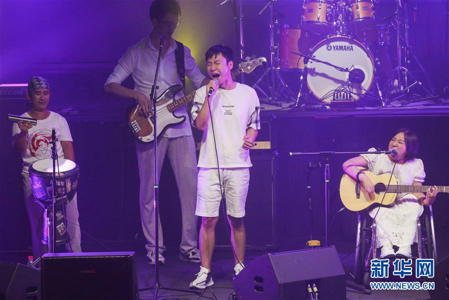 8月14日,8772樂隊成員田霄(中)在演唱會上表演。新華社記者張玉薇攝
