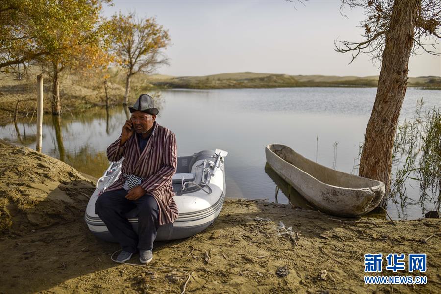 在羅布人村寨,阿木東·艾不東坐在湖邊接電話(2018年10月16日攝)。在旅游旺季,游客會(huì)通過電話提前向阿木東預(yù)約羅布烤魚。新華社記者 趙戈 攝