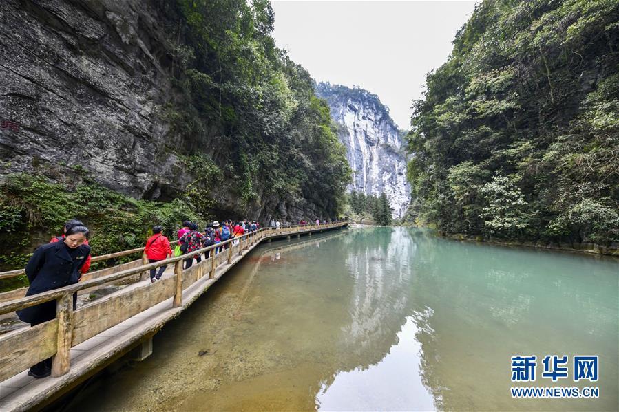 游客在天生三橋景區(qū)游覽(3月27日攝)。 隨著天氣轉(zhuǎn)暖,重慶武隆天生三橋景區(qū)風(fēng)景如畫,氣勢(shì)磅礴的天生石橋和綠意盎然的山林相映成趣,吸引眾多游客前來(lái)踏春賞景。 新華社記者劉潺攝
