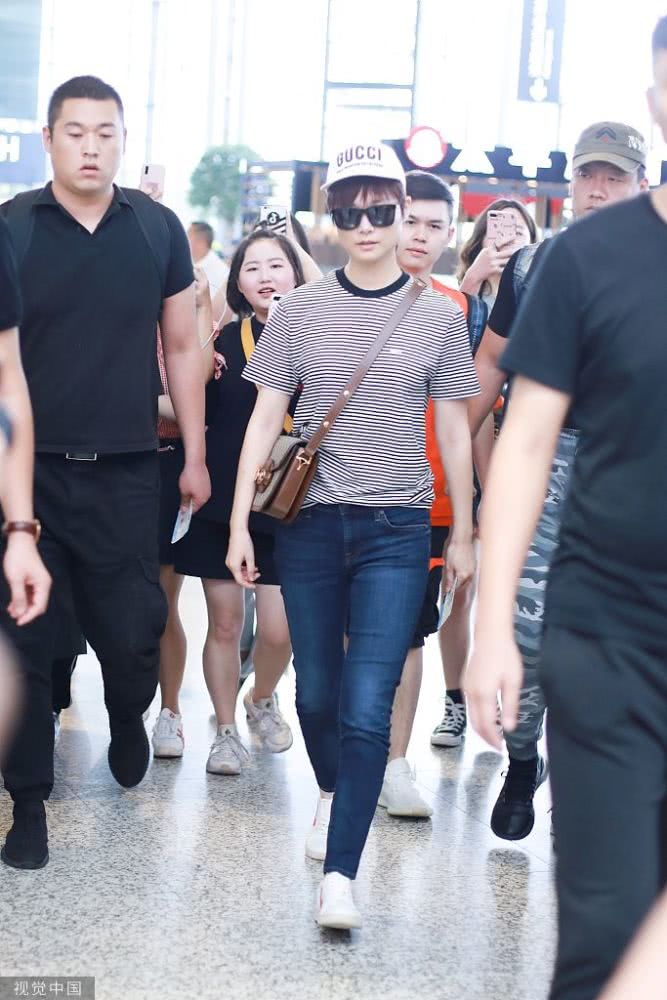李宇春條紋裝扮現(xiàn)身機場,青春活力,人氣爆棚