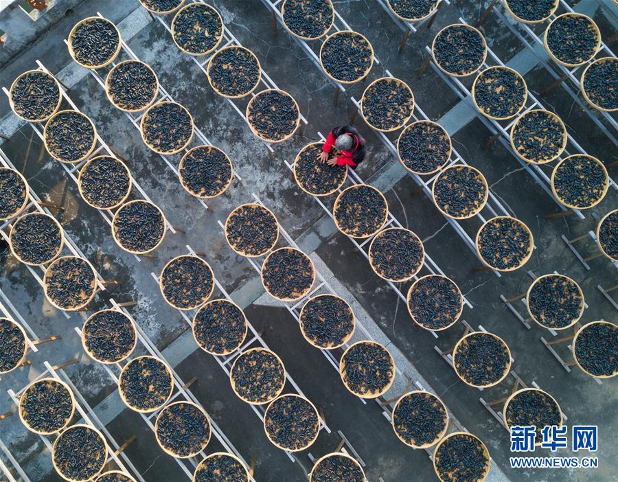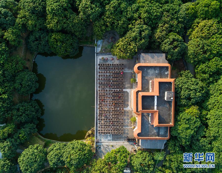 在福建省永春縣岵山鎮(zhèn)茂霞村熟地文創(chuàng)園,村民在晾曬用當?shù)貍鹘y(tǒng)手藝制作的藥材——熟地(1月28日無人機拍攝)。 新華社記者 宋為偉 攝