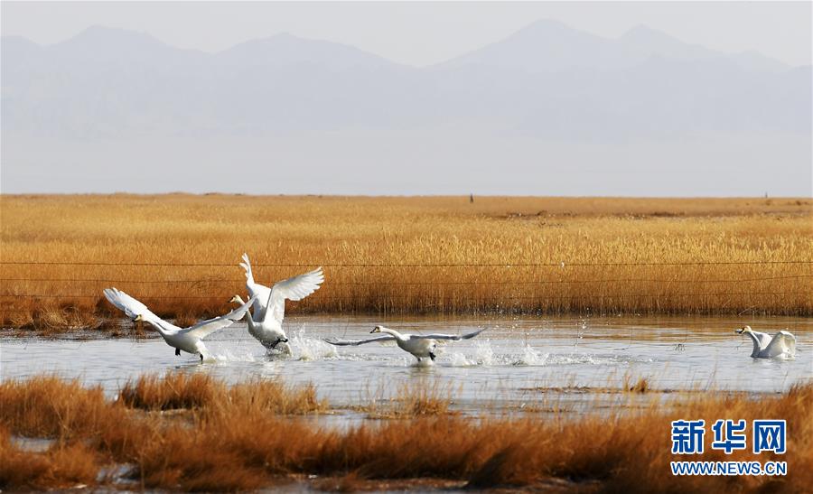 幾只白天鵝從甘肅省酒泉市阿克塞哈薩克族自治縣境內(nèi)的小蘇干湖濕地水面起飛(4月5日攝)。新華社記者 陳斌 攝