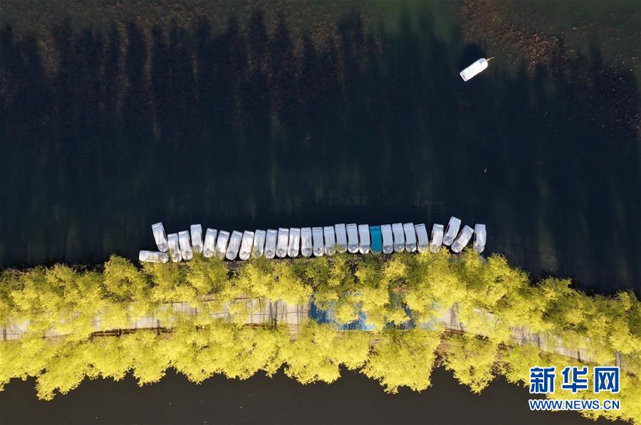 游船在白洋淀旅游碼頭內(nèi)行駛(4月10日無人機拍攝)。新華社記者牟宇攝