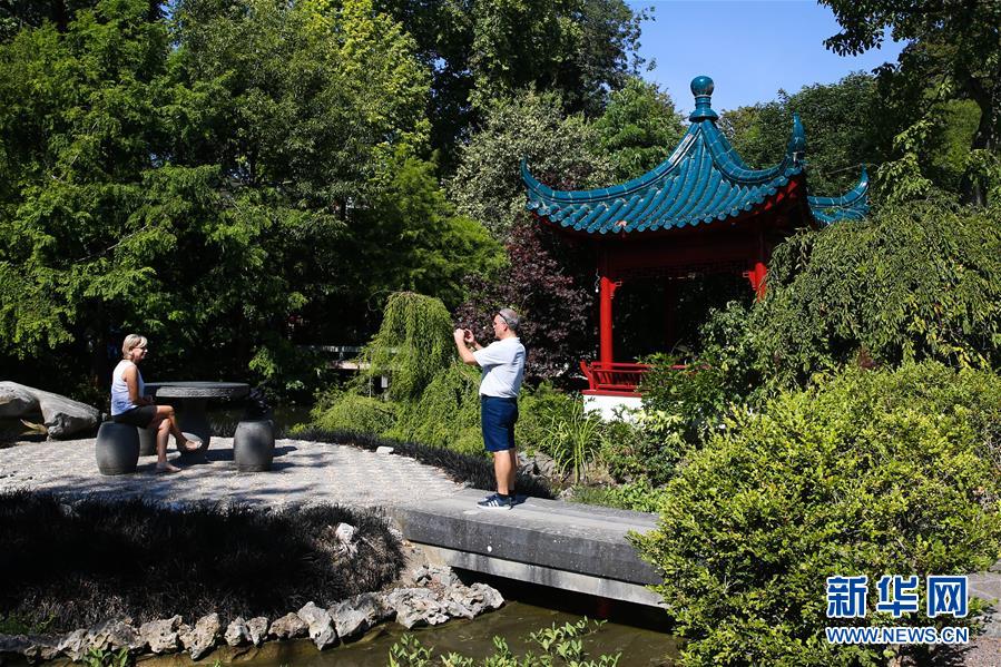 8月24日,在比利時(shí)布呂熱萊特市,游客在天堂動物園的“中國園”拍照留念。新華社記者 鄭煥松 攝