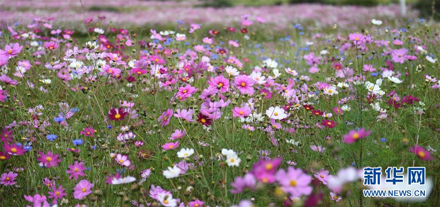 9月13日拍攝的尼木縣山谷間盛開的波斯菊。  新華社記者 晉美多吉 攝