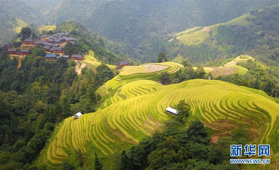 這是9月17日無人機(jī)拍攝的貴州省榕江縣計(jì)劃鄉(xiāng)計(jì)劃村陽開苗寨梯田。新華社記者 楊文斌 攝
