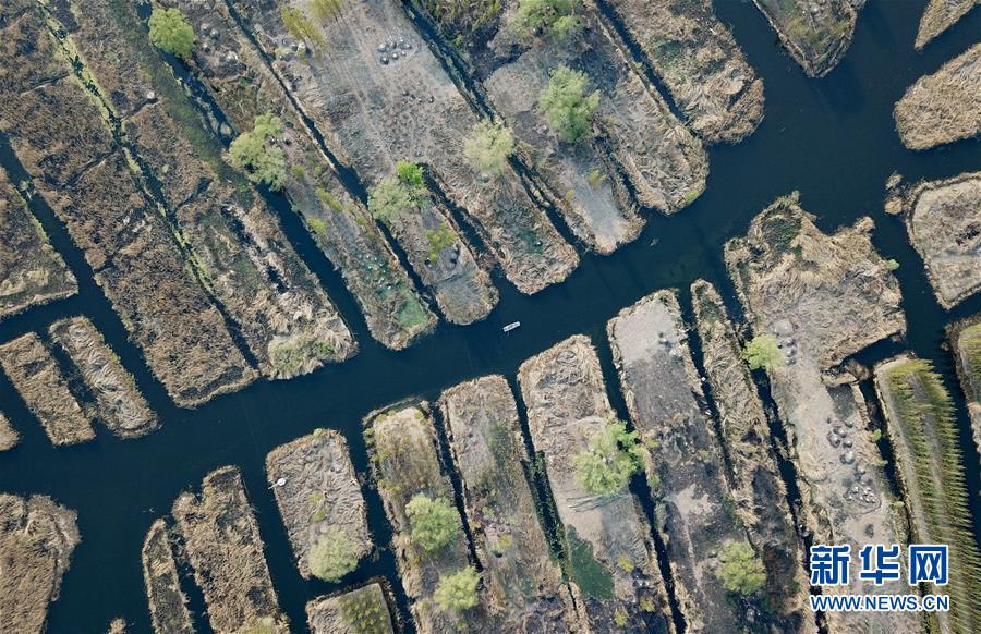 游船在白洋淀旅游碼頭內(nèi)行駛(4月10日無人機拍攝)。新華社記者牟宇攝