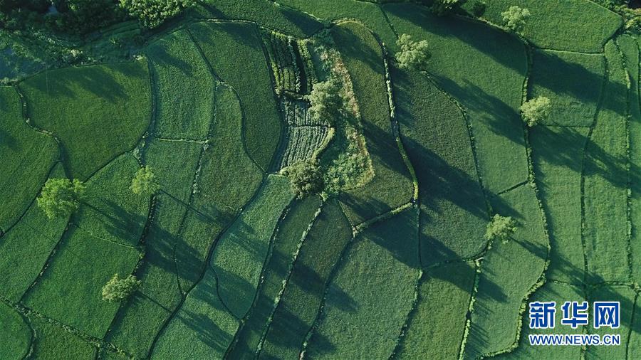 這是8月4日無人機(jī)拍攝的安徽黟縣宏村風(fēng)景區(qū)附近的農(nóng)田晨景。新華社記者張端攝