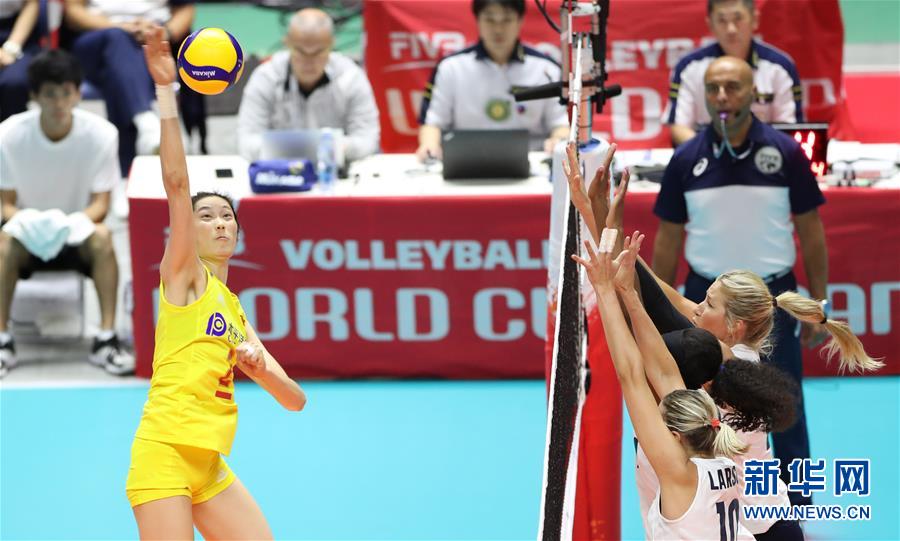 9月23日,中國隊球員顏妮(中)在比賽中扣球。當(dāng)日,在日本札幌舉行的2019年女排世界杯賽第二階段A組循環(huán)賽中,中國隊以3比0戰(zhàn)勝美國隊。新華社記者杜瀟逸攝