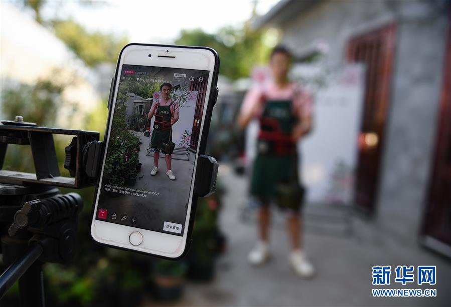 張炎在位于沭陽縣新河鎮(zhèn)新槐村的家中直播銷售月季花(8月24日攝)。 新華社記者 李響 攝
