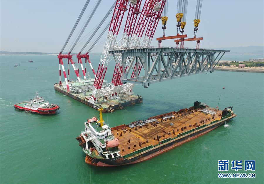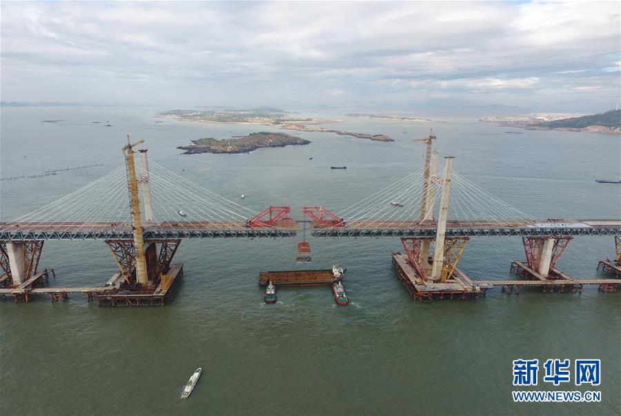9月21日,平潭海峽公鐵大橋鼓嶼門航道橋的鋼桁梁在吊裝中(無人機拍攝)。9月25日上午,隨著一段長17米、重473噸的鋼桁梁被精確固定到位,總長16.34公里的平潭海峽公鐵大橋合龍貫通。平潭海峽公鐵大橋是福州至平潭鐵路控制性工程,也是“十三五”規(guī)劃中北京至臺灣高鐵的先期工程。大橋起于福州市長樂區(qū),“踏”過四座小島后抵達中國第五大島平潭,上層設計為時速100公里的六車道高速公路,下層為設計時速200公里的高鐵。據福建福平鐵路公司介紹,大橋計劃2020年正式通車。在六年建設過程中,平潭海峽公鐵大橋所應用研發(fā)的多項技術、裝備創(chuàng)下國內外紀錄。新華社記者林善傳攝