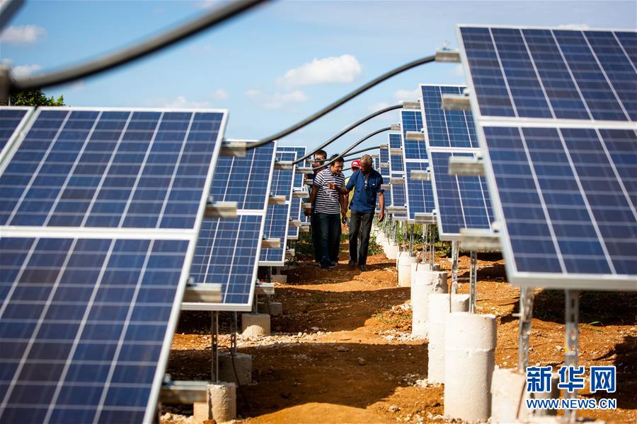 2013年11月3日,中古雙方施工人員在古巴首都哈瓦那市郊的展覽中心園區(qū)的中國(guó)援建的光伏電站內(nèi)工作。2013年11月4日,由中國(guó)北京控股集團(tuán)有限公司捐建的古巴1兆瓦光伏電站正式并網(wǎng)發(fā)電。該項(xiàng)目為中古合作共建,中方提供設(shè)備及技術(shù)指導(dǎo)。新華社記者劉彬攝