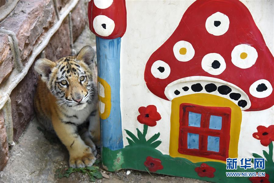 9月26日,孟加拉虎寶寶“小七”在自己的小窩里“玩?!薄?新華社記者 王凱 攝