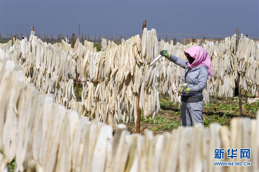 9月30日,寧夏吳忠市紅寺堡區(qū)馬渠生態(tài)移民安置區(qū)的農(nóng)民在晾曬蘿卜。新華社記者 馮開華 攝