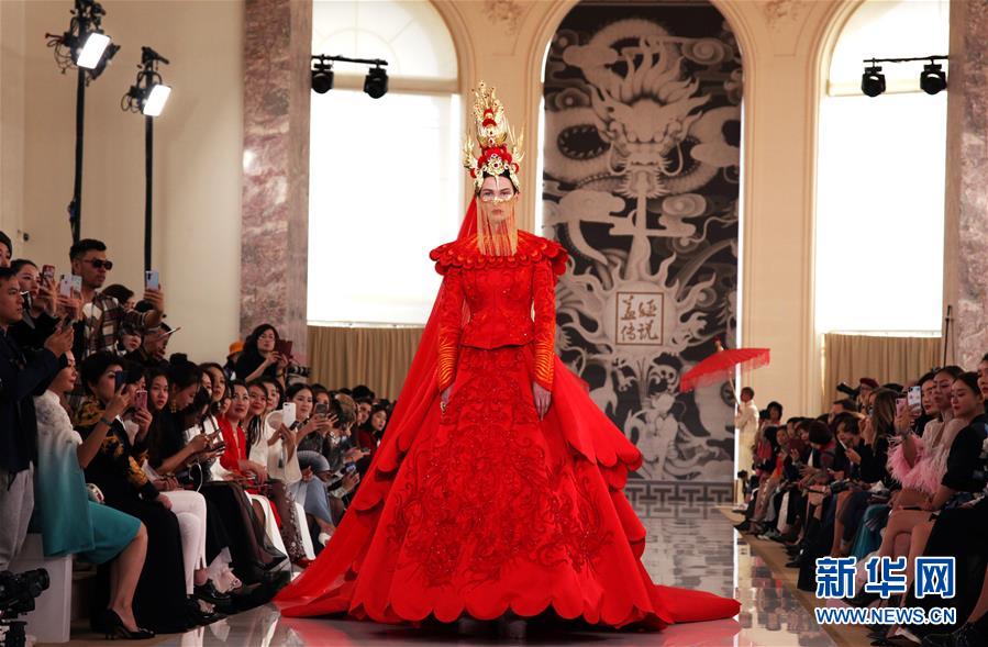 9月30日,在法國巴黎,模特展示中國高級女裝品牌“蓋婭傳說·熊英”2020春夏新品。