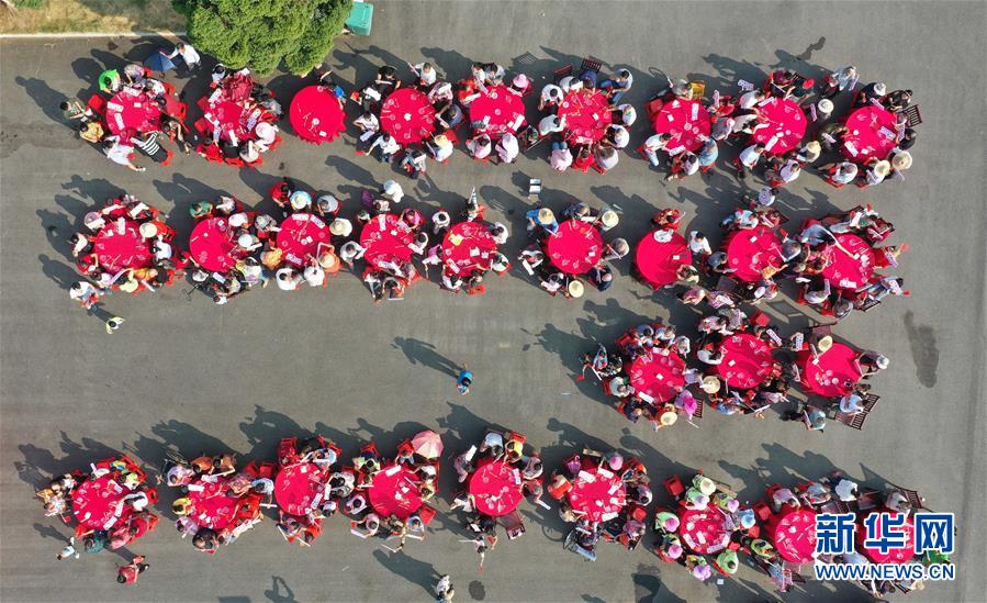 10月1日,在江西省南昌市南昌縣銀三角敷林村,當(dāng)?shù)卮迕衽e行“同吃國慶面 共迎國慶節(jié)”活動(dòng)(無人機(jī)拍攝)。當(dāng)日是國慶節(jié),全國各地的人們用各種方式歡度節(jié)日。新華社記者 彭昭之 攝